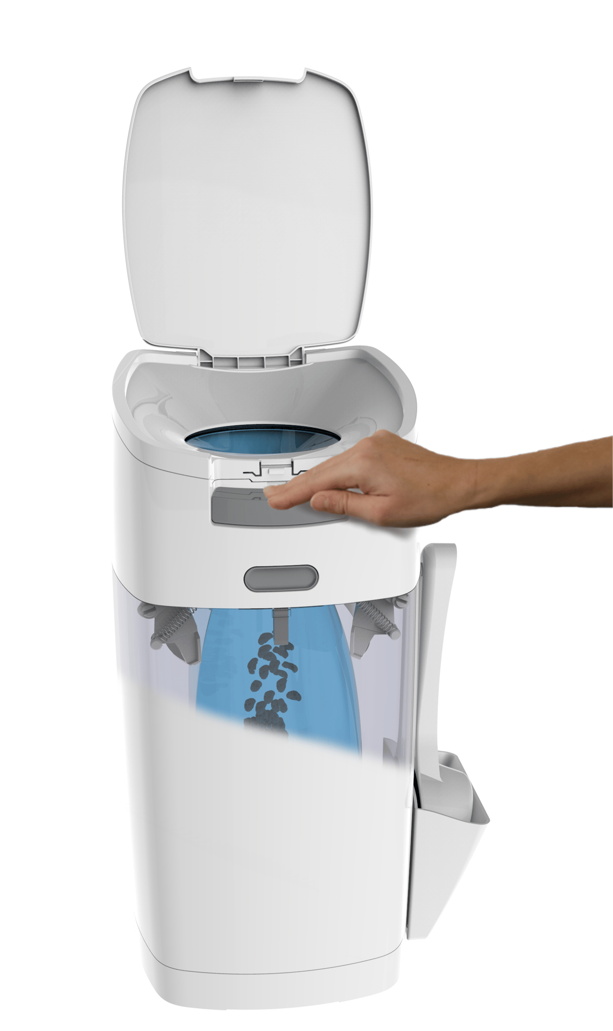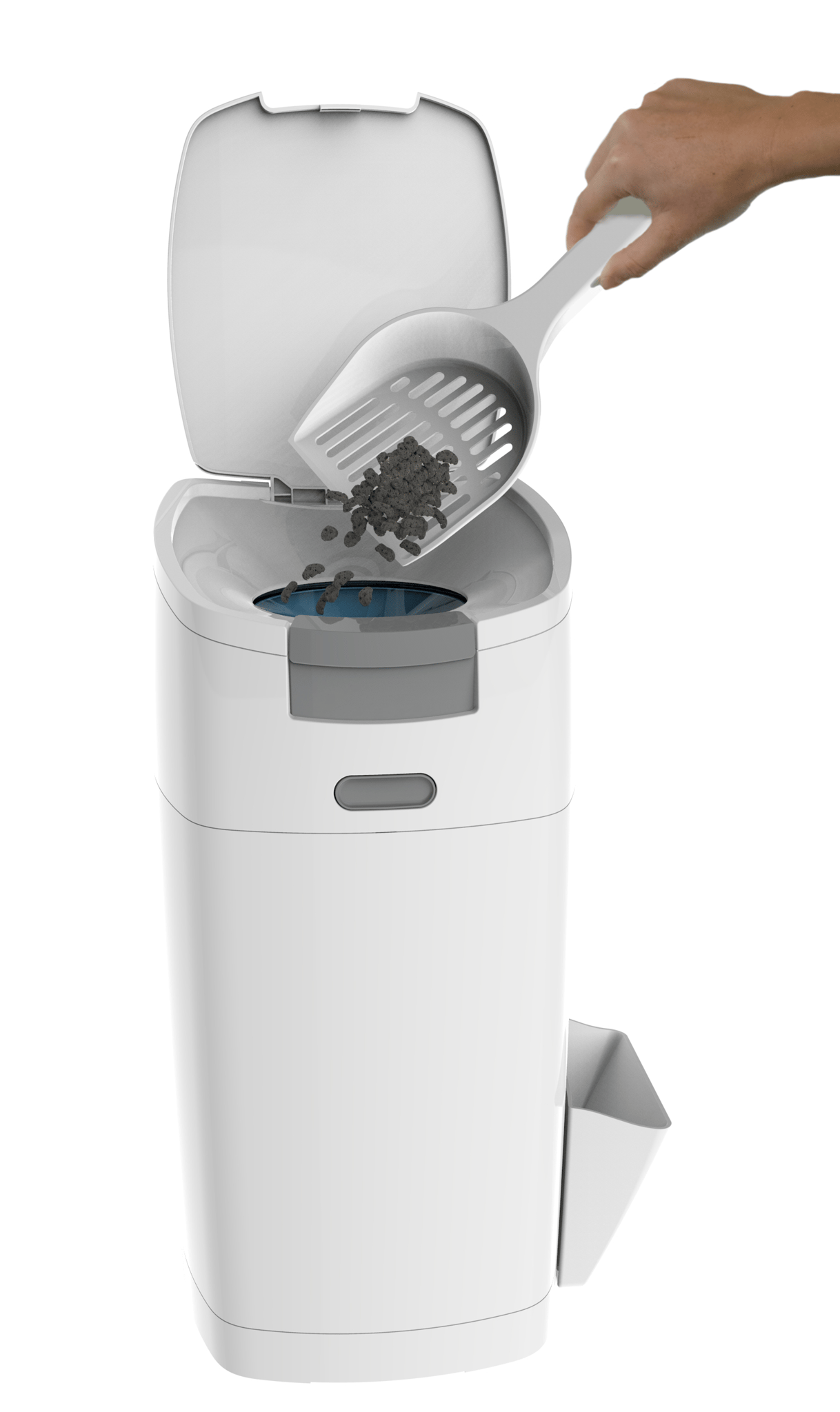 Das clevere Entsorgungssystem ermöglicht eine Einhandbedienung zur Entsorgung des Katzenstreu.